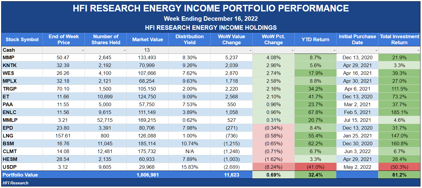 We’ve shared our thoughts on CLMT and why we don’t see a good fundamental-based reason for its selloff. Their recent decline from above $19 to $14 has moved them to “pound the table” buy territory. We believe they’ll fare well in the first half of 2023 as the company’s renewable diesel manufacturing facility enters service and the market more fully recognizes its value.