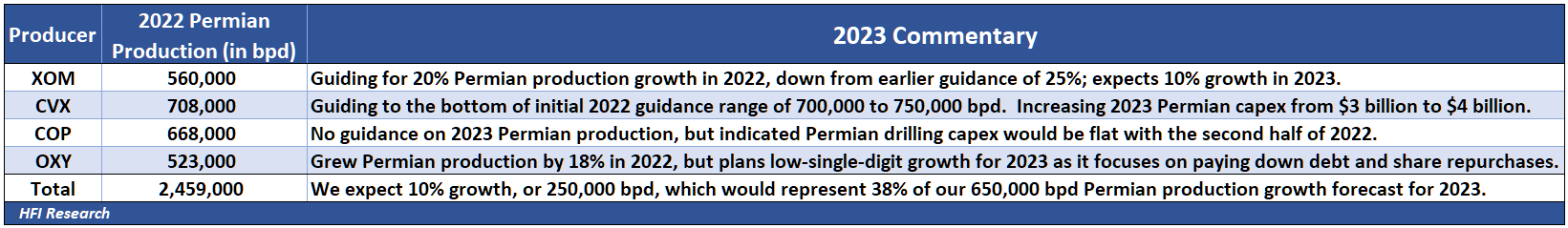Based on guidance to date, we expect the majors to increase their Permian production by 10% in 2023. This will add an incremental 250,000 bpd, which is 38% of our 650,000 bpd Permian growth forecast for 2023. If pressed, we suspect the majors could collectively boost their Permian growth to 15%, but this would only amount to an additional 175,000 bpd.