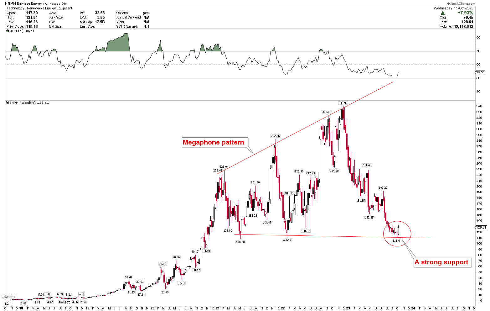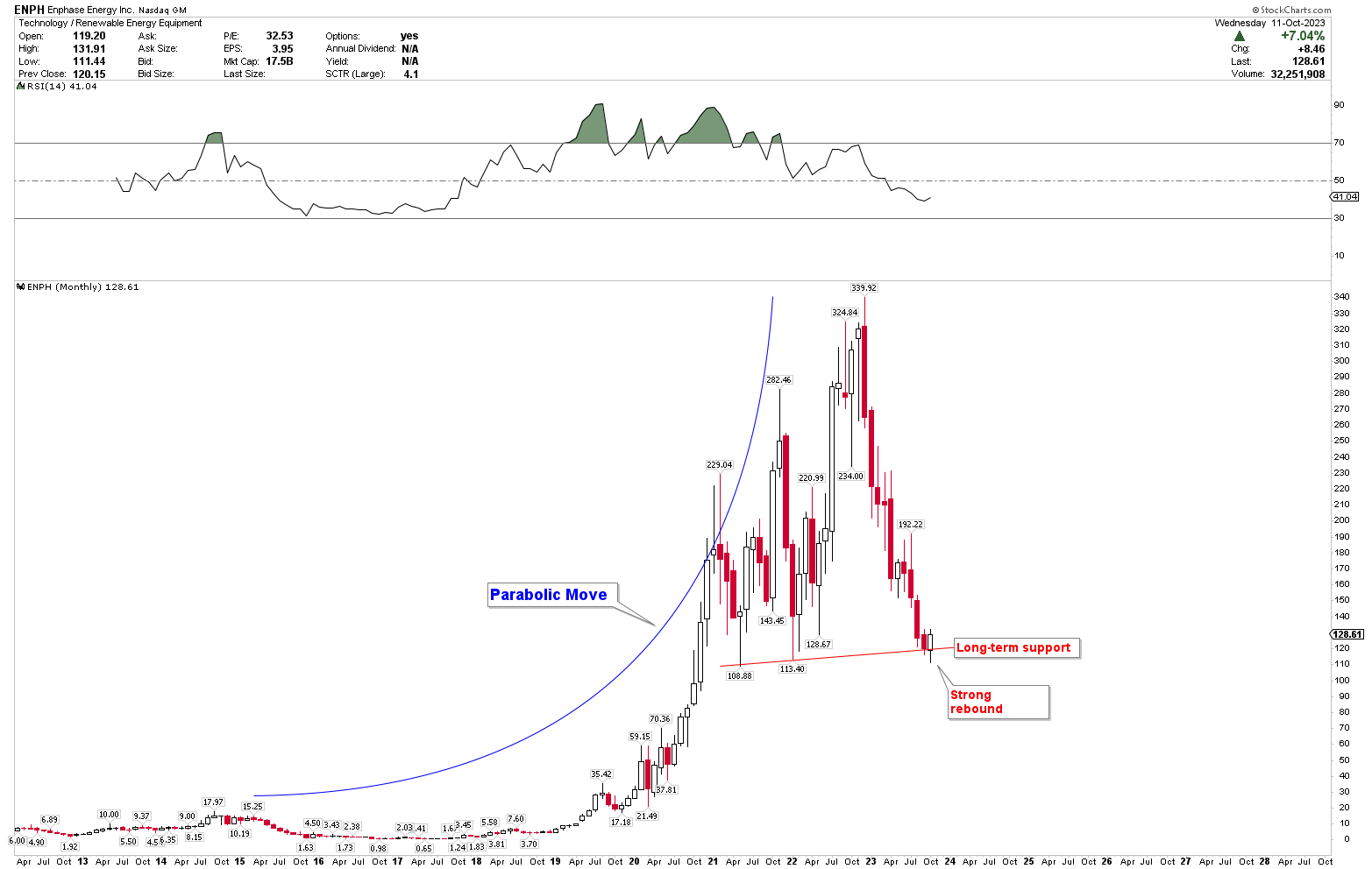 In the ever-evolving clean energy landscape, solar energy and battery storage have taken center stage, reaching beyond the well-known domain of electric vehicles (EV). Enphase Energy, Inc. (NASDAQ:ENPH) is among the key players, renowned for its expertise in developing batteries and microinverters tailored for businesses and consumers. Enphase Energy showcases remarkable adaptability amid a fluctuating macroeconomic environment. This article offers a technical examination of Enphase Energy’s stock price to identify its potential trajectory and investment prospects. Currently, the stock appears to be trading at a robust long-term support level, suggesting a potential upward trend.