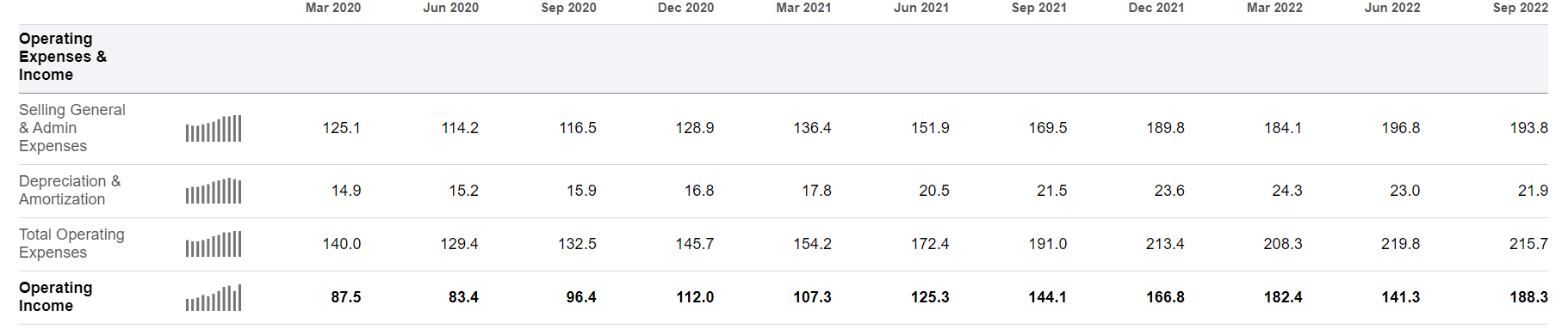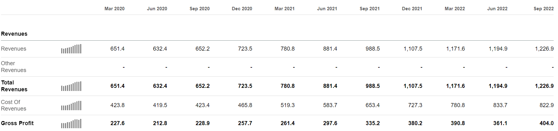 A few quarters don’t tell the full story, of course. Since the stock has depreciated far beyond the overall market this year, we should expect that it has been facing headwinds for its business. Starting with revenue, we see that this is actually not the case. Revenues have continued growing at a healthy pace throughout the last 2 years, without a single down quarter: