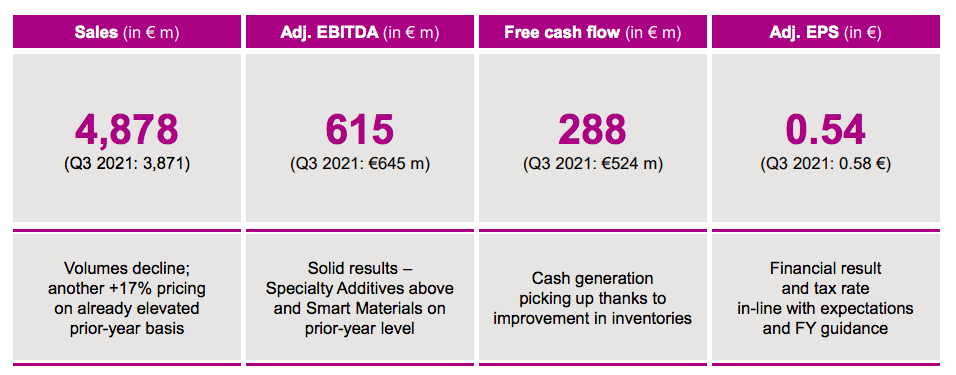 The results released were pretty in line with our estimates. In Q3, sales reached €4.88 billion with an increase of 26% compared to the top-line sales achieved in the same quarter of the previous year. Evonik also exceeded its internal forecast of €4.39 billion. However, the higher costs for energy and gas reduced the company’s net profit. In detail, the adjusted EBITDA stood at €615 million versus last year’s results of €645 million (and again beating VARA consensus estimates that were forecasting an average EBITDA of €608 million). It wasn’t just higher costs that weighed on the P&L, but also a decline in demand in the animal feed industry as well as in the performance materials division. Aside from the financial consideration it is important to highlight the company’s positive development.