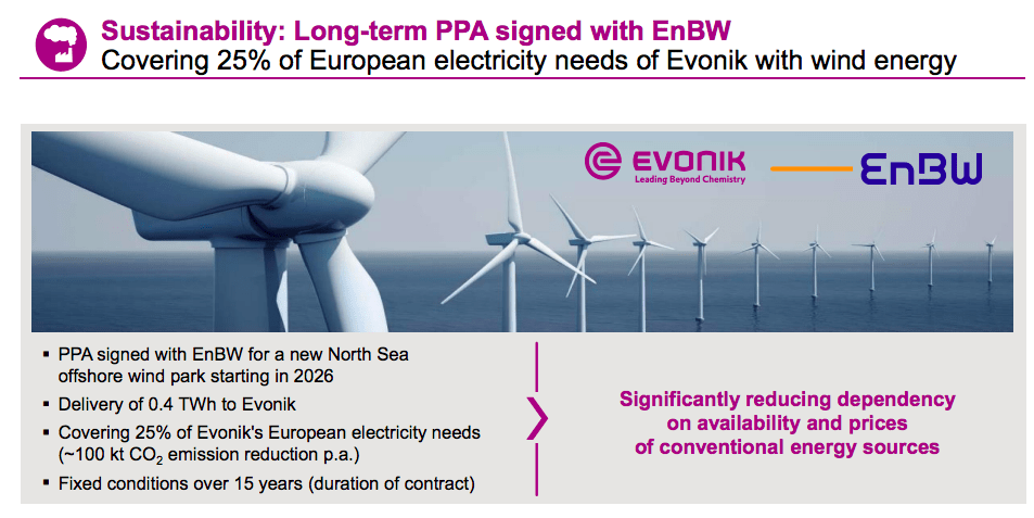 First of all, Evonik is reducing its dependency on gas, the German chemical player announced an agreement with the renewable energy operator EnBW to receive 100MW of green power (generated by a wind farm) for the next 15 years. In numbers, almost 25% of the company’s electricity needs in Continental Europe will be derived from green energy. As a reminder, Evonik’s geographical sales are divided into three main areas with the EU which accounts for 40% of its volumes.