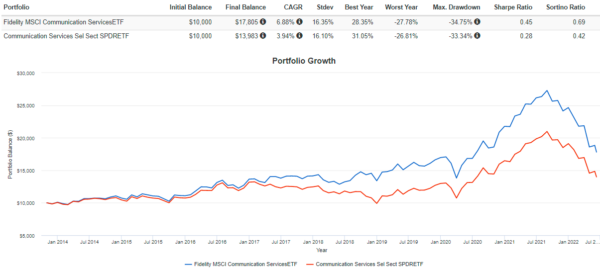 XLC and FCOM are two low-cost Communication Services sector ETFs that have declined by about 30% this year. While each has pros and cons, I favor FCOM because it overweights Alphabet, underweights Meta Platforms, and appears to have a bit more momentum. On the other hand, value investors may prefer XLC for its lower forward price-earnings ratio and the belief that Meta Platforms is nearing its bottom.