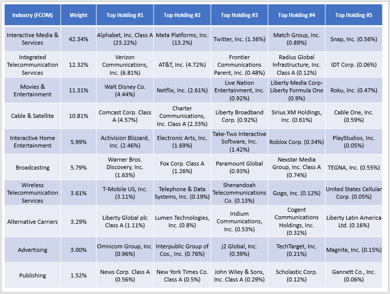 As shown, Interactive Media & Services, comprised of Alphabet, Meta Platforms (META), Twitter (TWTR), and Match Group (MTCH), make up 45.43% of the ETF, followed by Interactive Home Entertainment (11.27%), Cable & Satellite (9.29%), and Integrated Telecommunication Services (9.18%).