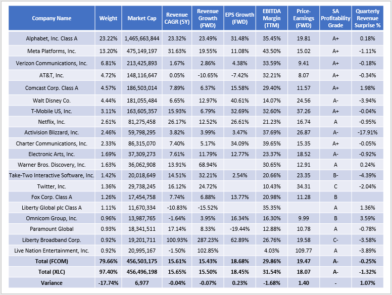 The value opportunity sounds excellent, but analysts have been trying to catch this falling knife for a while now. This year, article ratings on Meta Platforms were 33 strong buys, 77 buys, 21 holds, 15 sells, and two strong sells, yet the stock price is down nearly 50% YTD. The fact is that Meta’s average revenue surprise over the last four quarters is a mere 2.11% compared to 8.17% for the previous four quarters. Analysts have also downgraded the next quarter’s earnings expectations by 22.66% over the last six months. It’s just not a company I can get behind, and not one I want accounting for nearly 20% of an ETF like with XLC.