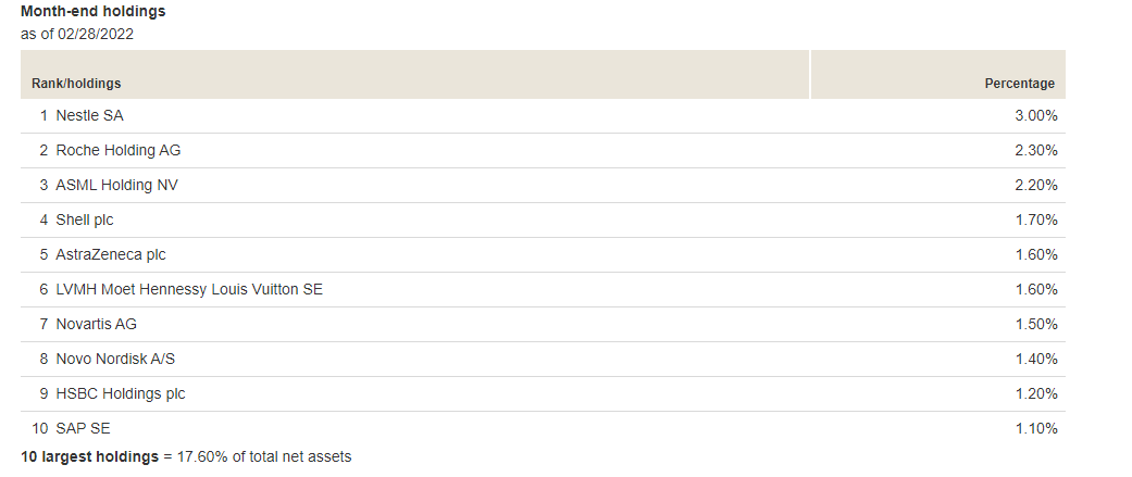 Well known, Large-Cap stocks dominate the list as expected, so much so that the Top 10 are almost 18% of the assets, despite VGK holding over 1360 stocks. The full holdings list indeed shows no currency-hedging assets.