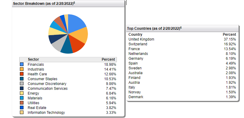 The overwhelming exposure to UK stocks explains the hedging of the British Pound to protect the performance from movement of the GBP against the USD. While Switzerland is listed second, their currency, the Swiss Franc (17%), places third behind the 38% exposure to the Euro. There is also minor exposure to several other currencies.