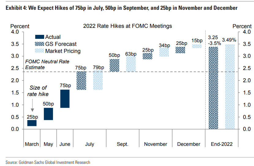 With recession fears mounting, traders have reined in their previous outlook for a very hawkish FOMC. In fact, traders now see monetary policy turning looser in 2023 via rate cuts. Between now and then, though, economists at Goldman Sachs see the Fed hitting a target range of 3.25% to 3.5%, slightly below market pricing at year-end.