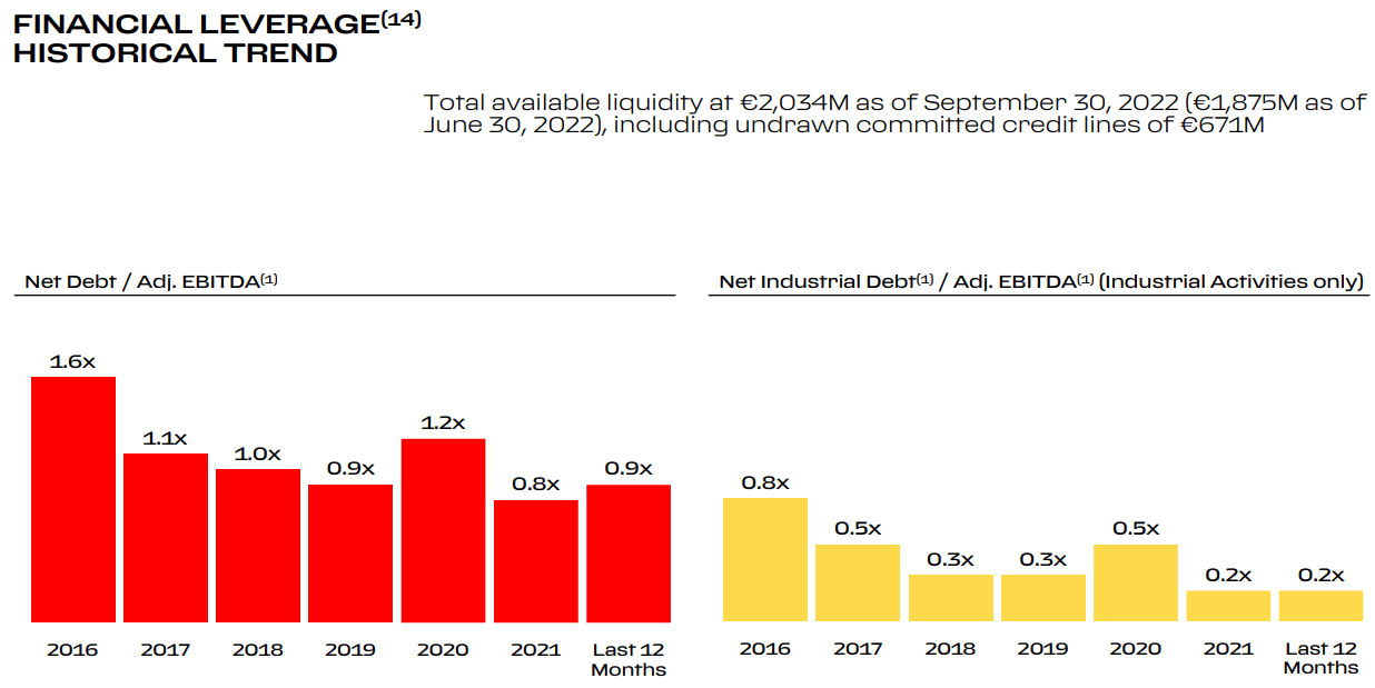 [Our industrial free cash flow generation] was partially offset by €198 million of capital expenditure that are progressing in line with our full year program of about €800 million. In the quarter, the capitalization ratio of our development expenses was approximately 45% increase versus the prior year also as a result of the cap research spending in Formula 1. Net industrial debt as of the end of September 2022 was €256 million, decreased by €130 million compared to June 2022, reflecting the solid industrial free cash flow generation net of the €85 million of share repurchases.