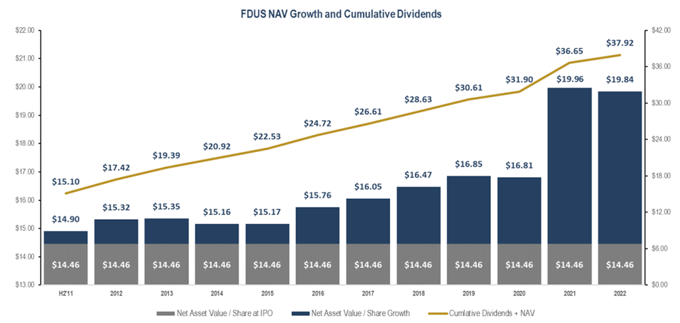This strategy has worked well for FDUS, as it has grown its net asset value per share substantially since IPO, all while delivering a high amount of cumulative dividends. As shown below, investors at IPO have realized more than double their initial value through a combination of NAV/share appreciation and cumulative dividends.