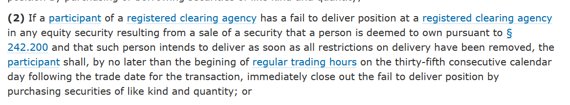 So whenever a stock is shorted so much that shares fail to be returned they’re essentially placed on a watchlist. They remain on that list until the original shares which failed to be delivered are reconciled. If the FTDs remain outstanding for 35 consecutive trading periods then shorts are forced to close their positions due to Regulation SHO.