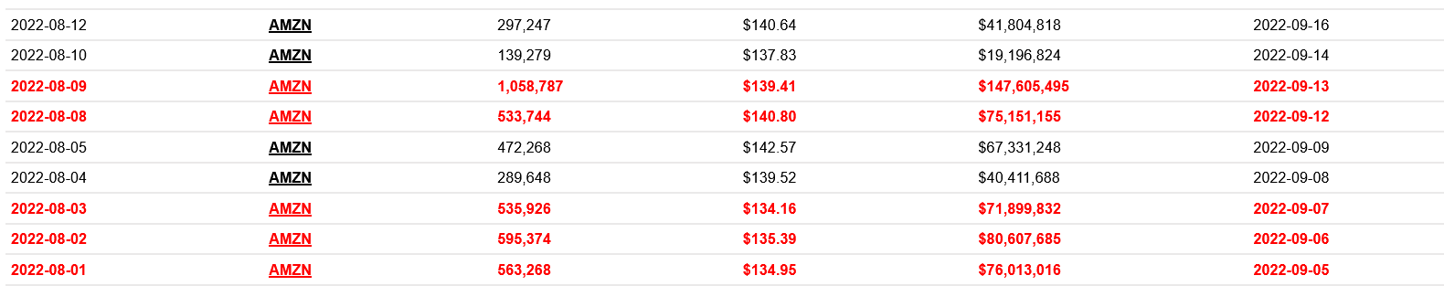 What this data shows is that between now and Sept. 16 there are a number of FTDs that must be closed out if they haven’t already. We can do the math and it totals to 4.486m shares that have to be bought due to FTDs in the beginning of August. To understand the potential impact on the stock price we can look at volume data. Average 10-day volume for AMZN is 47.7m shares meaning these FTDs are unlikely to cause much change in the stock price. Shorts should be able to cover amidst normal trading.