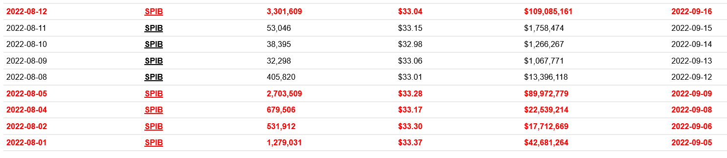 In this instance we can see that 9.025m shares need to be bought. Average volume for SPIB is only 3.8m, though it was near 4.5m earlier this month. So the amount of shares that need to be bought is actually above daily volume. The daily volume coupled with 35 days of trading should still allow shorts plenty of room to buy back shares without impacting the stock price too much.