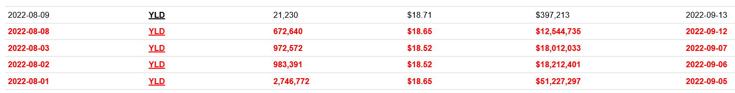 From a review of some high FTD stocks in early August it looks possible that YLD may see forced buyers pushing the stock price up in the coming trading sessions.