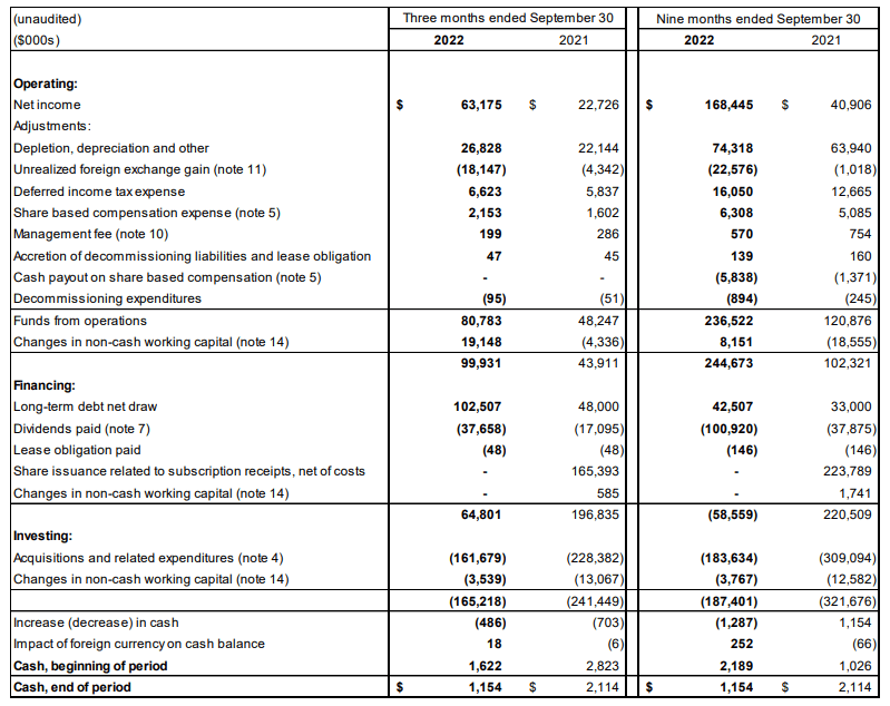 So while the Q3 EPS of C$0.42 and the 9M 2022 EPS of C$1.12 appear to be attractive, it’s also very important to pull up the cash flow statement. As you can see below, Freehold reported a C$81M funds from operations. That also is the free cash flow (after deducting C$48,000 in lease payments) as a royalty company does not have to contribute a single dollar to the ongoing capital expenditures on an oil asset. Freehold buys a royalty, pays upfront in cash, and that’s it. This means the depletion and depreciation expenses are just an accounting element.