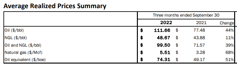 During the quarter, the company recorded an average oil price of just over C$110/barrel while the average realized natural gas price was C$5.51, resulting in an average realized price of just over C$74 per barrel of oil-equivalent. That’s an increase of approximately 51% compared to the third quarter of last year, thanks to the 68% increase in the average realized natural gas price.
