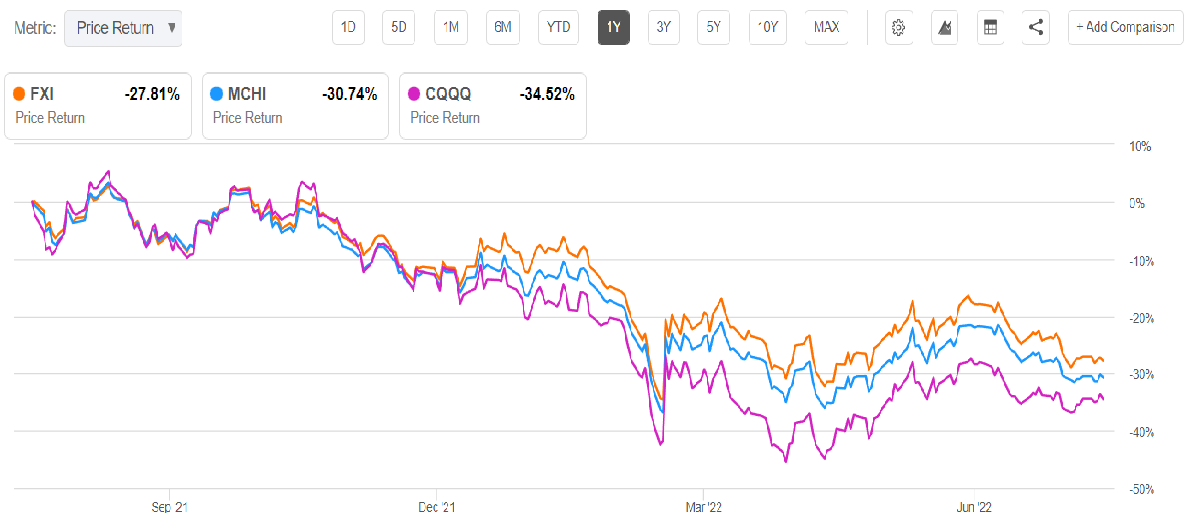 First, before going into details, my reason for choosing FXI is that, with a performance of -27.8%, it has suffered relatively less than peers iShares MSCI China ETF (MCHI) and Invesco China Technology ETF (CQQQ) during the last one-year period.
