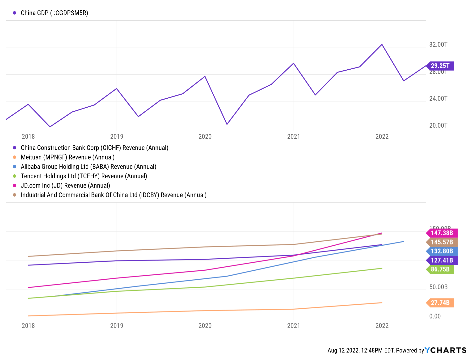 Comparing China’s GDP and Annual revenues of FXI’s top six holdings (ycharts.com)