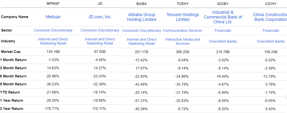 Another reason for the volatility, especially for companies operating in the tech sector, is China’s regulators imposing strict regulations and big fines on companies without having a clear plan of action on regulations. Furthermore, woes impacting the property sector have dragged down the performance of financial companies. Thus, whether it is the one-month, or one-year performances, these are all negative as shown in the table below.