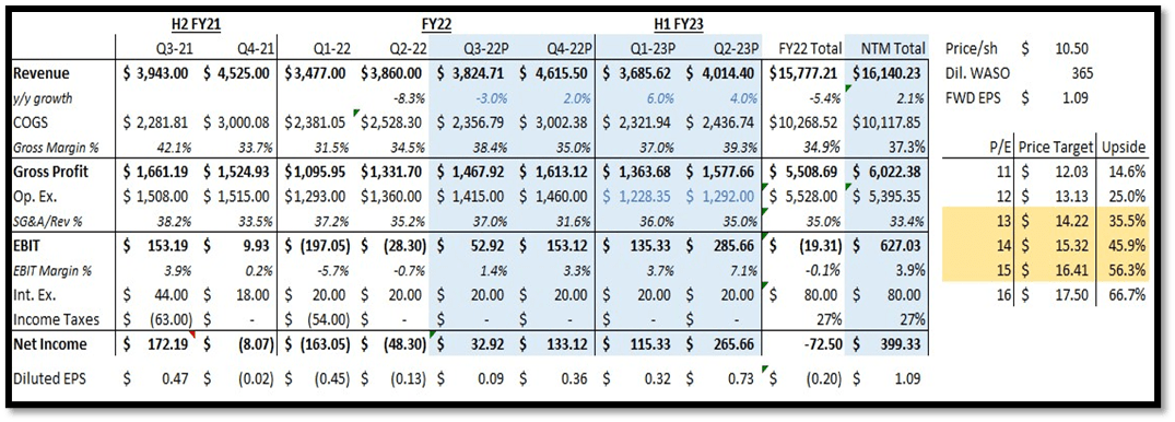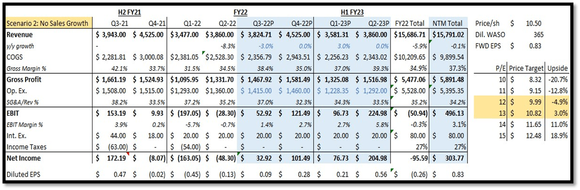 The model above shows a 5% reduction in SG&A spend (blue font color), but negative sales growth in Q3, no sales growth in Q4 ’22 and Q2 ’23, and a minor jump for Q1 ’23 (these revenue growth projections are also marked with the blue font color). This combination of lower SG&A but mostly flat growth gives us a fair value of ~$10.50/sh (12x/13x fwd multiple). This poses a similar question to scenario 1: how realistic is the above sales growth forecast?