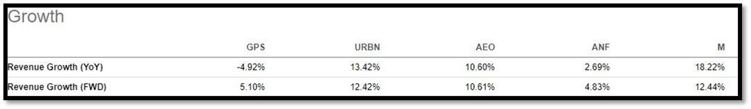 Screenshot of TTM Revenue Growth and NTM Revenue Forecasts for Gap and Competitors (Seeking Alpha)