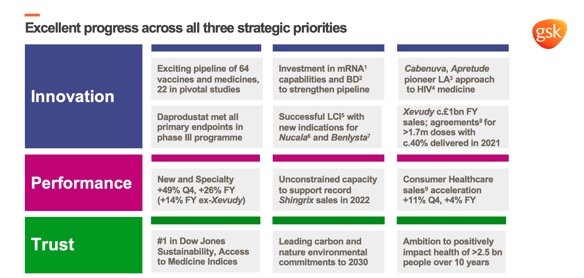 The company even gave us 2022 guidance, where the company expects excellent overall results from the coming year. Overall, it can be said that GSK is currently outperforming on the basis of two factors.