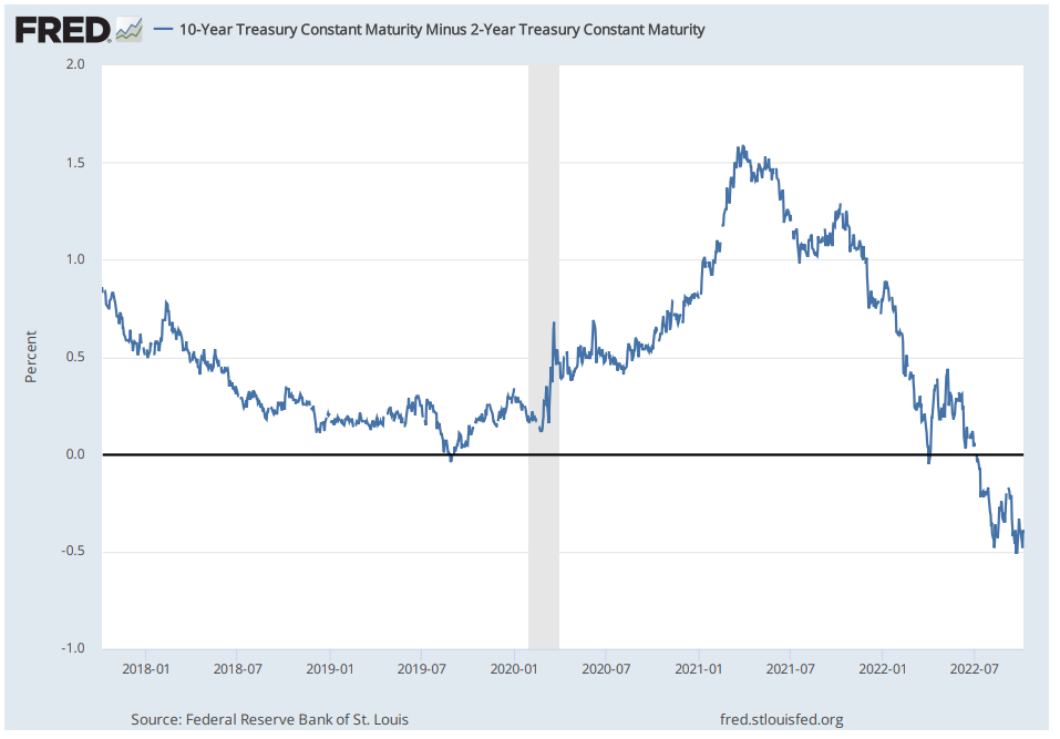We are nearing another big problem – many experts argue a recession may be about to come true in the US. One of the most reliable recession indicators is considered to be the Treasury yield spread, the difference between the 10-year Treasury and the 2-year Treasury yields. After this curve gets inverted, on average it takes recession between 6 months and 1 year to come. I have been watching this indicator for a while. It was in the beginning of April 2022 when it first inverted since 2019. This can be seen from the graph below.