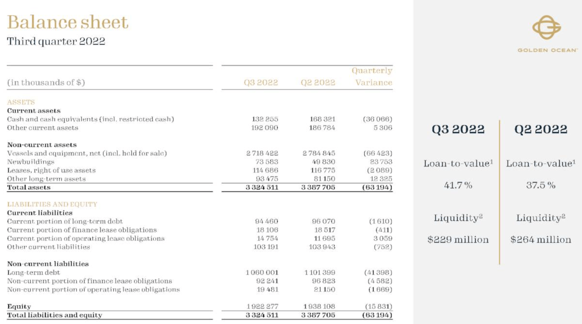 Moving on to cash flow, Golden Ocean reported an operating cash flow worth $98.7 million in its third quarter, a steep decline from the $156 million it generated in its second quarter.