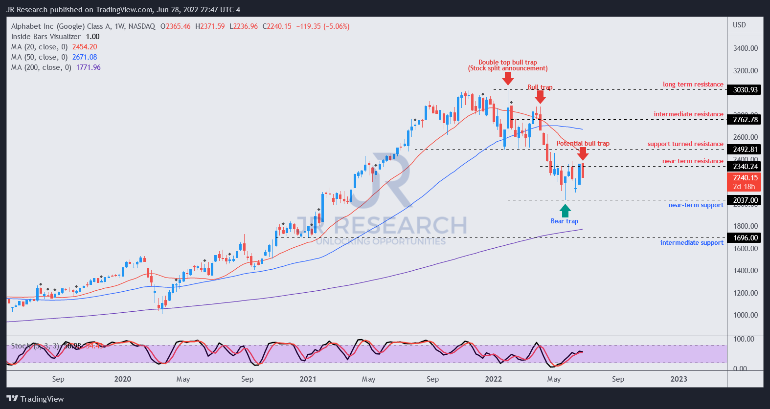 Our price action analysis also indicates a double top bull trap (which we missed earlier in the year) that drew in buyers astutely into its stock-split announcement post-FQ4 earnings. It led to a significant rejection of further buying momentum and also decisively reversed its bullish bias. So, the market has set up the move to digest GOOGL’s massive gains since late January/early February. As a result, we urge investors to continue paying close attention to GOOGL’s price structures to discern essential clues into the market’s forward intentions.