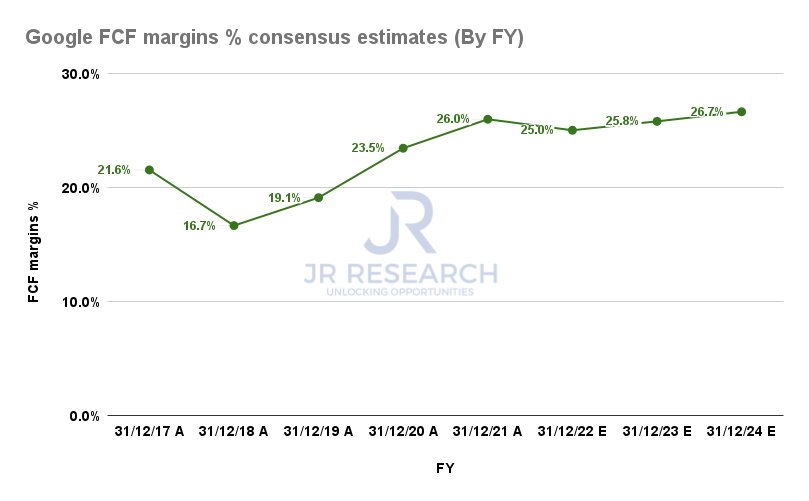 Notwithstanding, Google’s inherent operating leverage could help sustain its robust FCF margins, which undergirds its valuation. Despite the significant moderation in revenue growth, the consensus estimates indicate an FCF margin of 25% in FY22, just slightly below FY21’s 26%.