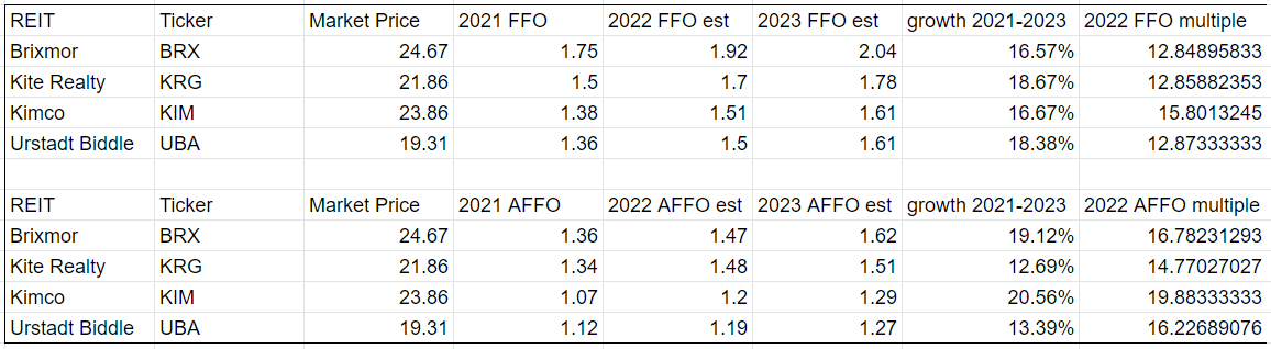 Grocery anchored shopping centers have quickly become a highly desired real estate asset class as grocery stores provide such a reliable supply of foot traffic. Prices of the grocery anchored REITs have been rising, but four of them still trade at attractive valuations: Kimco (KIM), Brixmor (BRX), Kite Realty (KRG) and Urstadt Biddle (NYSE:UBA). I think any of these four would be a solid investment, but the two that really stand out to me are UBA and KRG. This article will provide an overview of the relative valuation within the sector and then go deeper on the specific fundamentals of UBA. Later this week we will post our Kite Realty analysis to Portfolio Income Solutions.