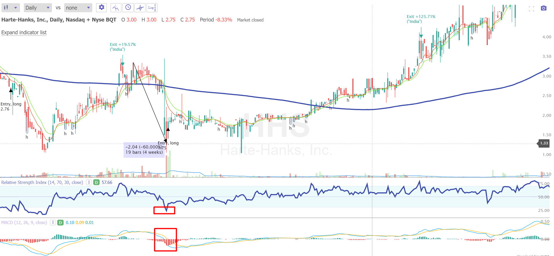 Considering today’s oversold conditions (RSI below 30), I wonder if the current extremely low levels of the RSI are a sufficient argument for buying HHS. But to check that, you have to base the criterion for exiting a position – why not focus on the RSI again? For the exit, I chose the other extreme of this indicator – an extremely overbought RSI level of 75 and higher (I remind you that theoretically the stock is already considered overbought at the RSI >70).