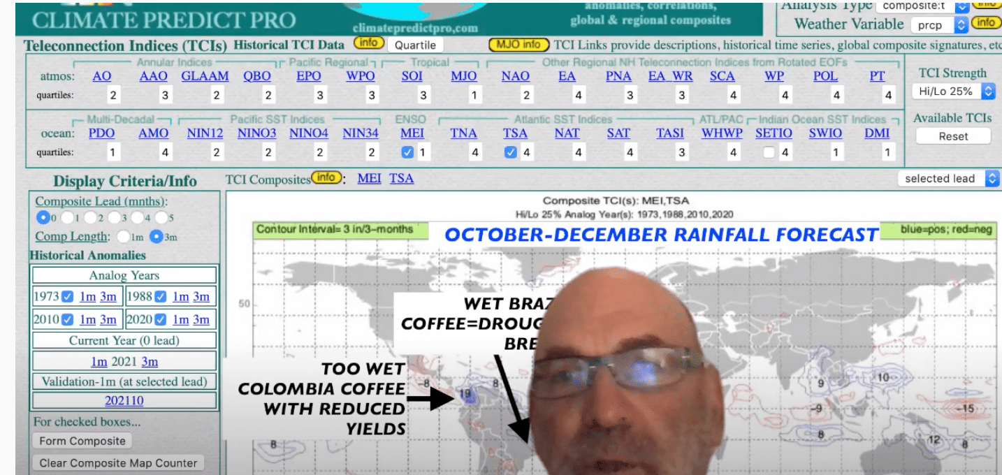 - It is estimated that Brazil produces about 30% of the world’s coffee supply. This year’s crop has recovered from drought as I began forecasting last October using teleconnections such as La Niña and the warm Tropical Atlantic. Next year’s 2023 coffee crop could be huge, barring a frost this winter (Brazil’s summer) or a return to drought later this year.