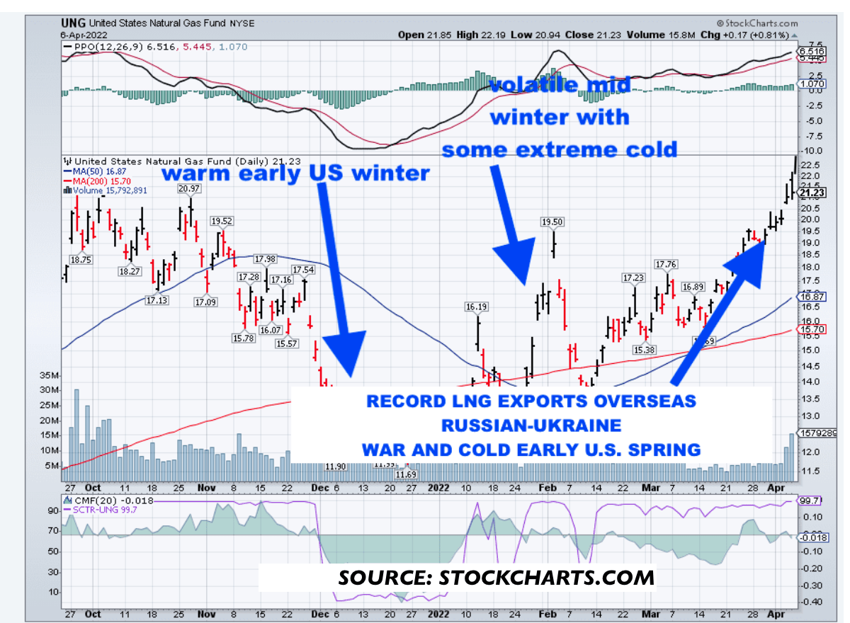One can see on this chart just how volatile natural gas prices were to the weather this winter. Again, presently the major bull trend has been inspired by other factors, not just weather.