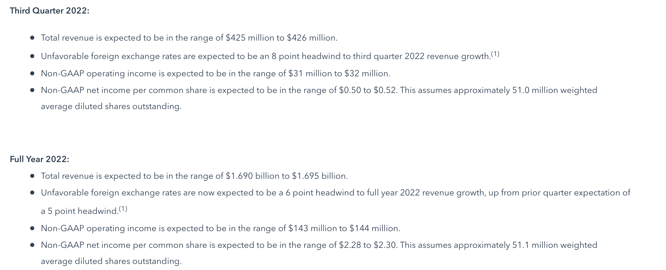 For the current fiscal year, HubSpot has lowered its revenue guidance to $1.69-$1.695 billion, representing 28% y/y growth (versus a prior view of 32-33% y/y growth), but this reduction was driven primarily by an update in unfavorable FX rates.