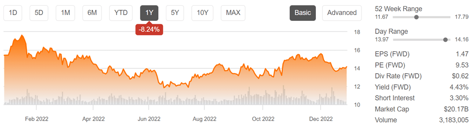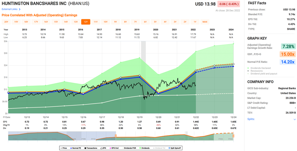 Lastly, I find value in HBAN at the current price of $14.10 with a forward PE of 9.6, sitting well below its normal PE of 14.2 over the past decade. Analysts have an average price target of $16.21, which translates to a potential total return in the high teens.
