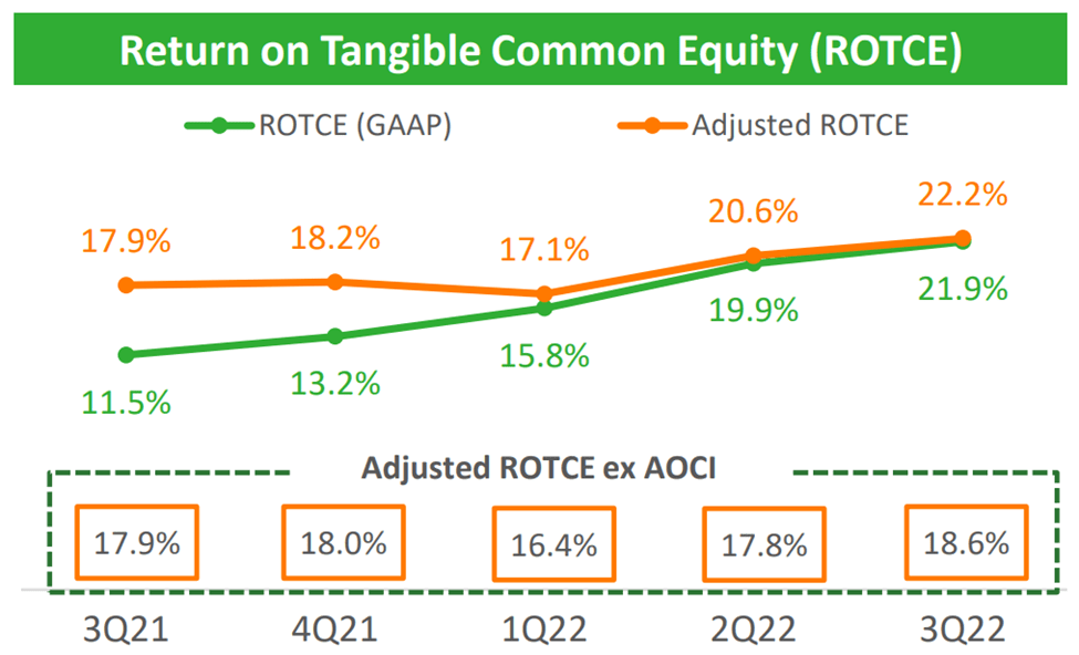 Since the acquisition, HBAN has delivered solid operating results, with adjusted EPS growing by 11% YoY to $0.39 in the third quarter. Moreover, HBAN has seen a meaningful improvement in its return on tangible equity. As shown below, both adjusted ROTCE, with and without AOCI, have demonstrated improvement over the past year. For reference, accumulated other comprehensive income (AOCI) is the bucket that’s designated for unrealized profits or losses.
