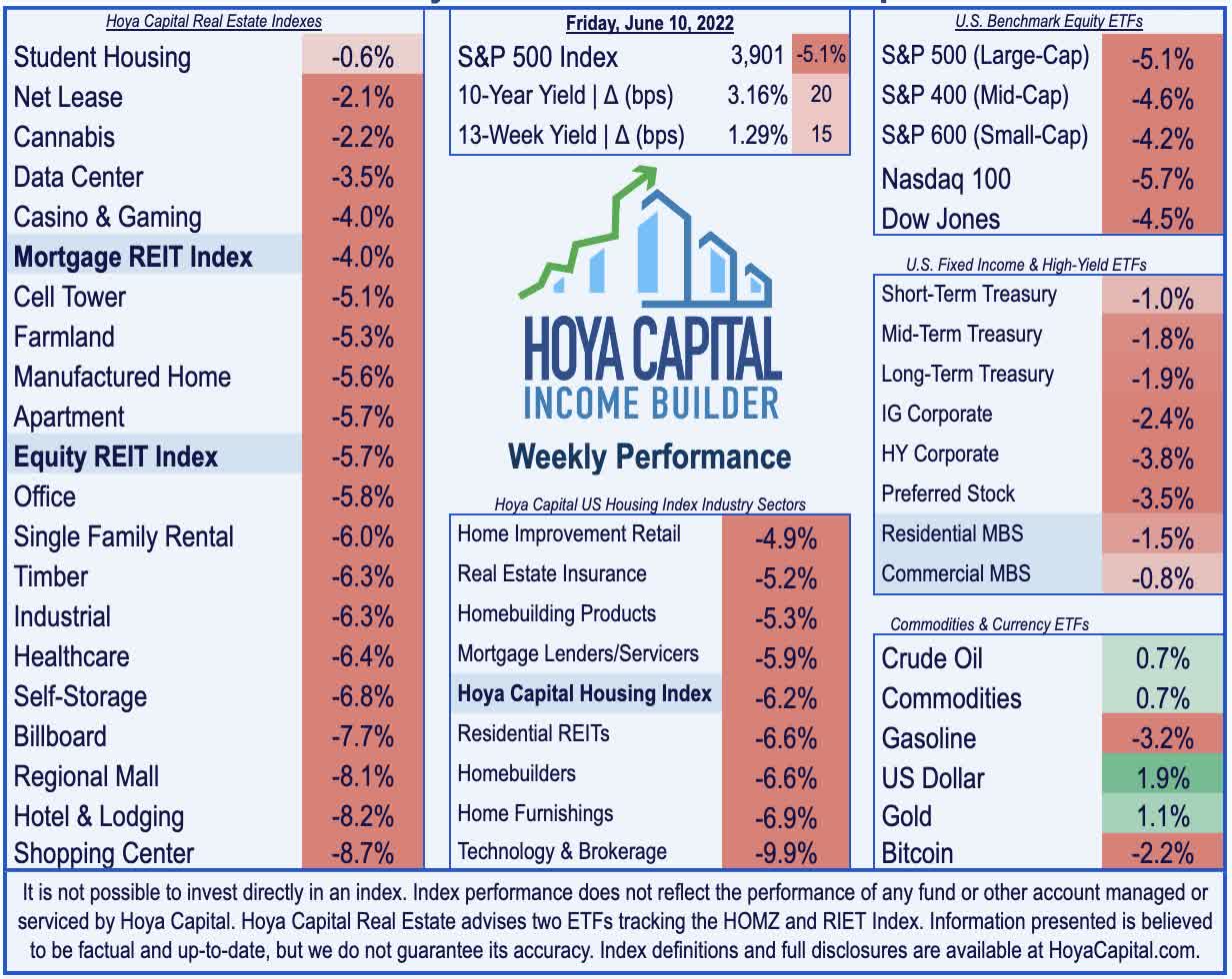 Disclosure: Hoya Capital Real Estate advises two Exchange-Traded Funds listed on the NYSE. In addition to any long positions listed below, Hoya Capital is long all components in the Hoya Capital Housing 100 Index and in the Hoya Capital High Dividend Yield Index. Index definitions and a complete list of holdings are available on our website.