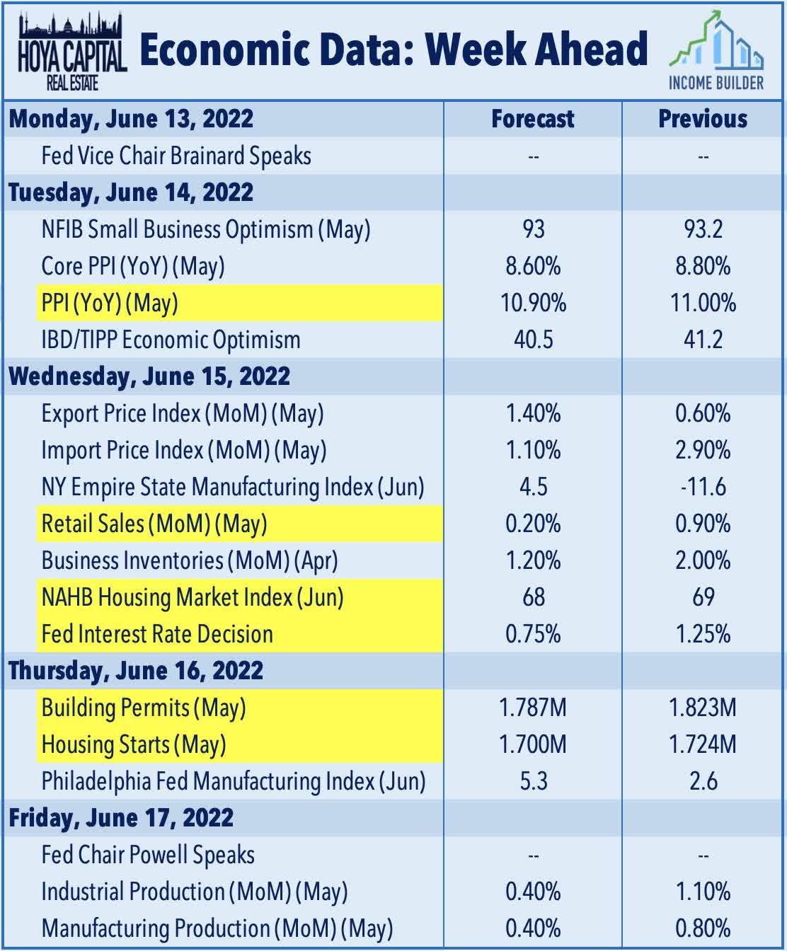 We’ll see a jam-packed week of economic data and monetary policy decisions in the week ahead. On Tuesday, we’ll see inflation data with the Producer Price Index for May, which investors are hoping will signs of cooling from its record-high increases seen in March and April. On Wednesday, we’ll see Retail Sales data – which is expected to show the lowest month-over-month increase of 2022 – while Homebuilder Sentiment is expected to show a moderation to 68 which would be the lowest level since early in the pandemic. All eyes will be on the Federal Reserve on Wednesday afternoon for the FOMC Interest Rate Decision. The Fed is expected to raise policy rates by 50 basis points but guide to a more path of hikes for the balance of 2022. Finally, on Thursday, we’ll see Housing Starts and Building Permits which is expected to show a continued moderation in the pace of new home construction.