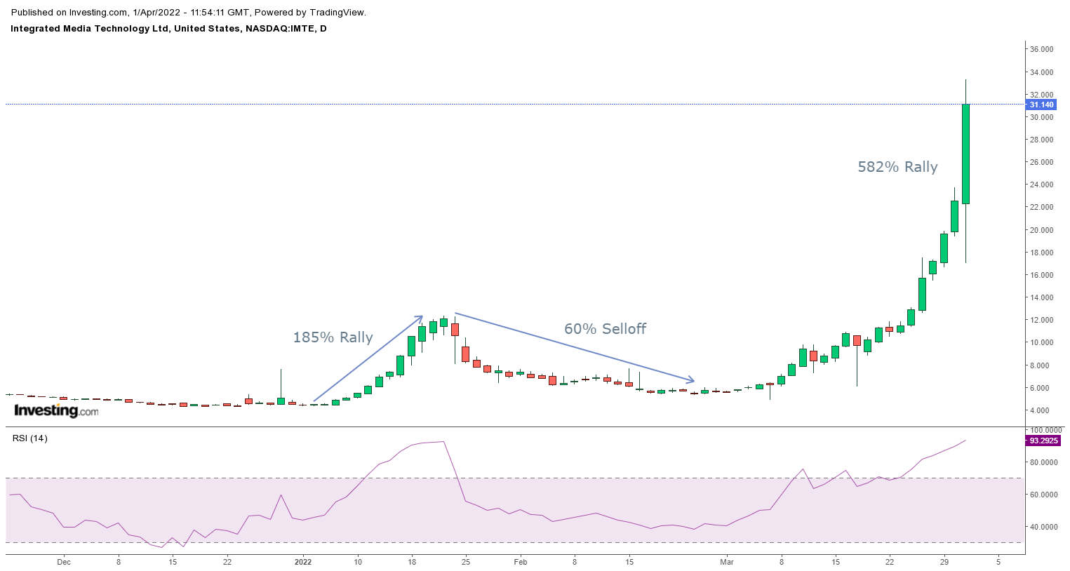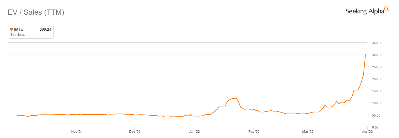 The headline says it all. I won’t bury the lead. Shares of Integrated Media Technology Limited (NASDAQ:IMTE) have been on a rocket ship ride over the last several weeks. As of Thursday’s close, shares moved up over 450% from February’s closing price. With a move like that, investors might take notice and wonder if Integrated Media Technology Limited is a buy. This company now trades at 300x enterprise value to sales off a mix of news-related hype, a low float, and pure momentum. I would not be touching it up here.