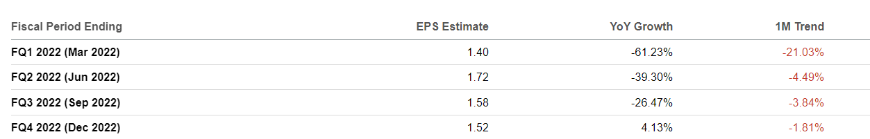 As highlighted in the chart above, analysts have been cutting their Q1 2022 bottom line EPS forecasts aggressively in the past month. Specifically, the first-quarter EPS estimate was reduced by -21% between early March and early April. This is aligned with my views expressed earlier that the expected weak financial performance for C in the first quarter of 2022 should be factored into its consensus numbers and valuations to a large extent.