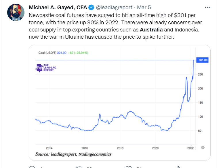 As highlighted in The Lead-Lag Report, the country’s profile as a notable global commodity participant has attracted the attention of the bulls, particularly considering how the supply side has been disrupted on account of the Russian-Ukraine tussle. Australia gets plenty of attention for its prowess with industrial metal exports, but don’t also discount the impact of some of its agricultural imports. If you’re a subscriber of The Lead-Lag Report, you’d note that I’ve been writing about a potential commodity supercycle in the years ahead and I’ve also covered in detail the impact of Russian-Ukraine developments in the agricultural markets. Australia looks like one of those economies that could really exploit and benefit from developments here; consider something like the wheat market. Russia and Ukraine are believed to contribute over 100m tons of the global wheat trade. Australia clearly can’t make up for that gap but yet still the US Department of Agriculture estimates that Australia will likely see a record wheat crop this year and could potentially export 27.5m tons in the 2021-2022 year.