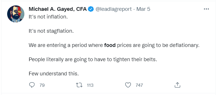 I also want to reiterate that typically, food prices rise in a slow and steady manner, enabling food producers to be well-positioned to make pricing adjustments to keep pace with inflation, but in recent weeks, it has been anything but slow and steady leaving producers with very little elbow room to make pricing adjustments. What I’m trying to reiterate is that don’t underestimate the “shock factor” in the current pricing premium of agricultural products which can often prove to be fleeting rather than long-standing.