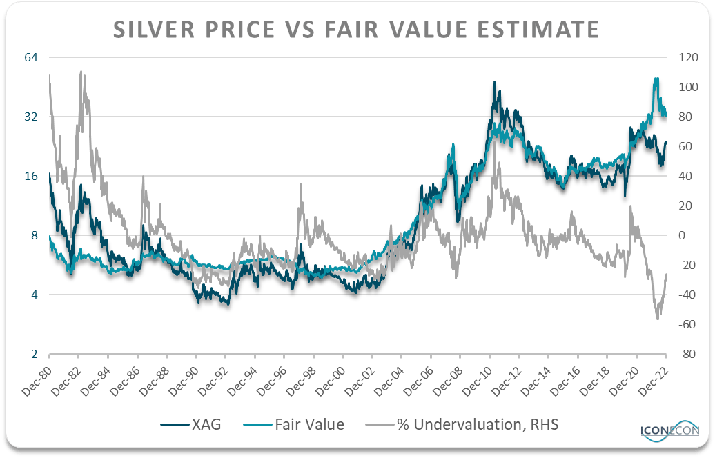 While silver faces short-term risks from rising real yields and weaker commodity prices, the metal remains undervalued from a long-term perspective. The chart below shows the price of silver relative to its fair value based on its long-term correlation with a 50:50 basket of gold and the commodity complex. I have used this chart in several articles over recent years to show how silver is deeply undervalued, and while this degree of undervaluation has narrowed significantly in recent months, the metal still looks cheap.