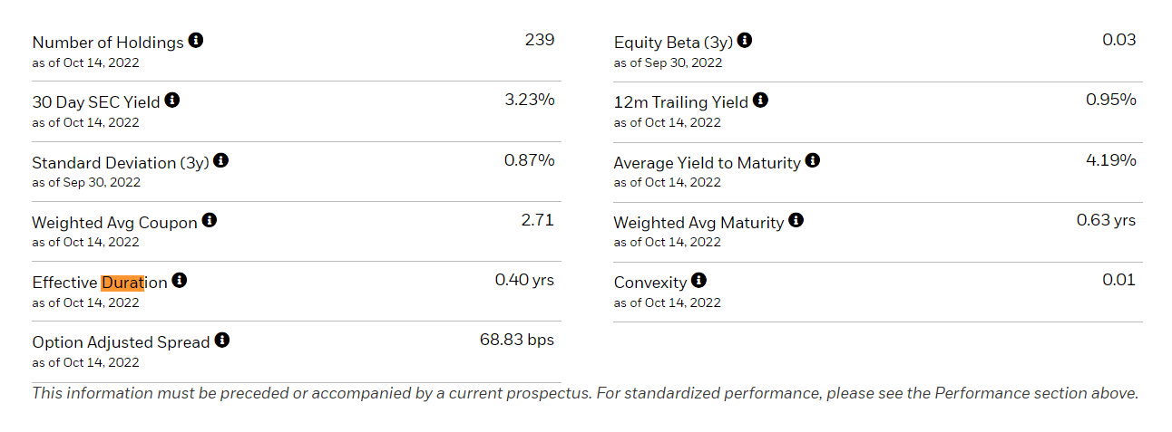 We can see that over 31% of the fund has a maturity date of less than 7 days. Even more importantly more than 45% of the fund has a tenor of less than 30 days. This maturity profile results in the fund’s extremely short duration of only 0.4 years: