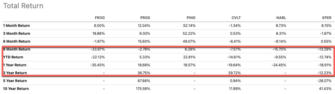 With the price dive back under the 200DMA, FROG remains in a persistent downtrend starting from the all-time high set soon after the September, 2020 IPO. Accordingly, FROG has under-performed other software growth stocks that did not peak until last November. That under-performance is particularly stark against peers (selected by Seeking Alpha) in the 9-month, YTD, and 1-year total returns.