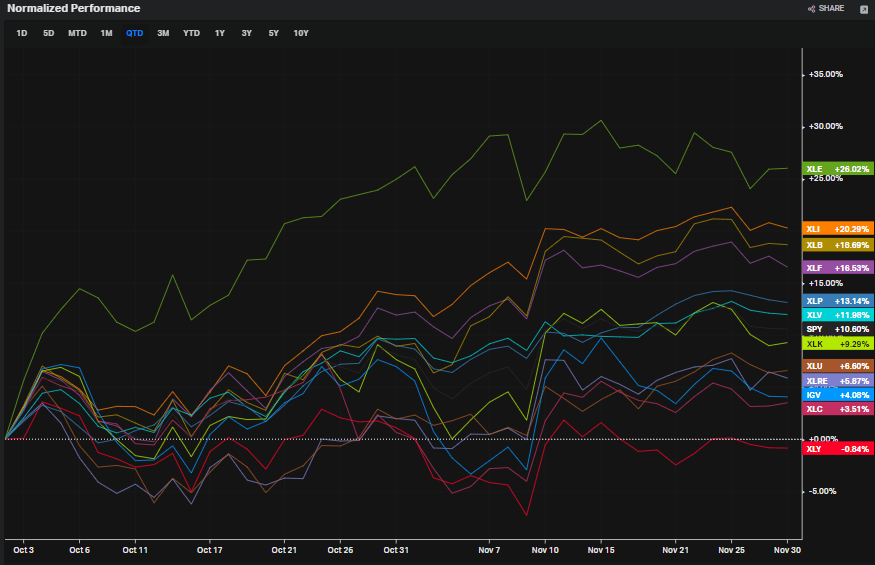 KBE’s relative strength peaked in October, right around the all-important September CPI report that marked at least a near-term low in the S&P 500. Other value areas like the Industrials, Materials, and Energy sectors have done well in the last six weeks. Financials have lagged those leading areas modestly, but I see some bearish risks on an absolute basis.