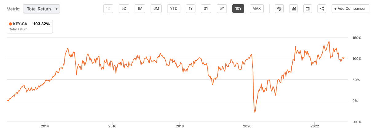 While the S&P500 made a 241% total return over the last ten years, Keyera only made a 103% total return (in local currency). The reason for this is shown in the following chart.