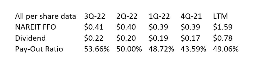 Kimco Realty increased its dividend payout from $0.17 per share per quarter in 4Q-21 to $0.22 per share per quarter in 3Q-22, representing a 29% YoY increase for passive income investors. The dividend was increased by 4.5% for the fourth quarter. The new quarterly dividend is $0.23 per share, for a forward dividend yield of 4.1%.