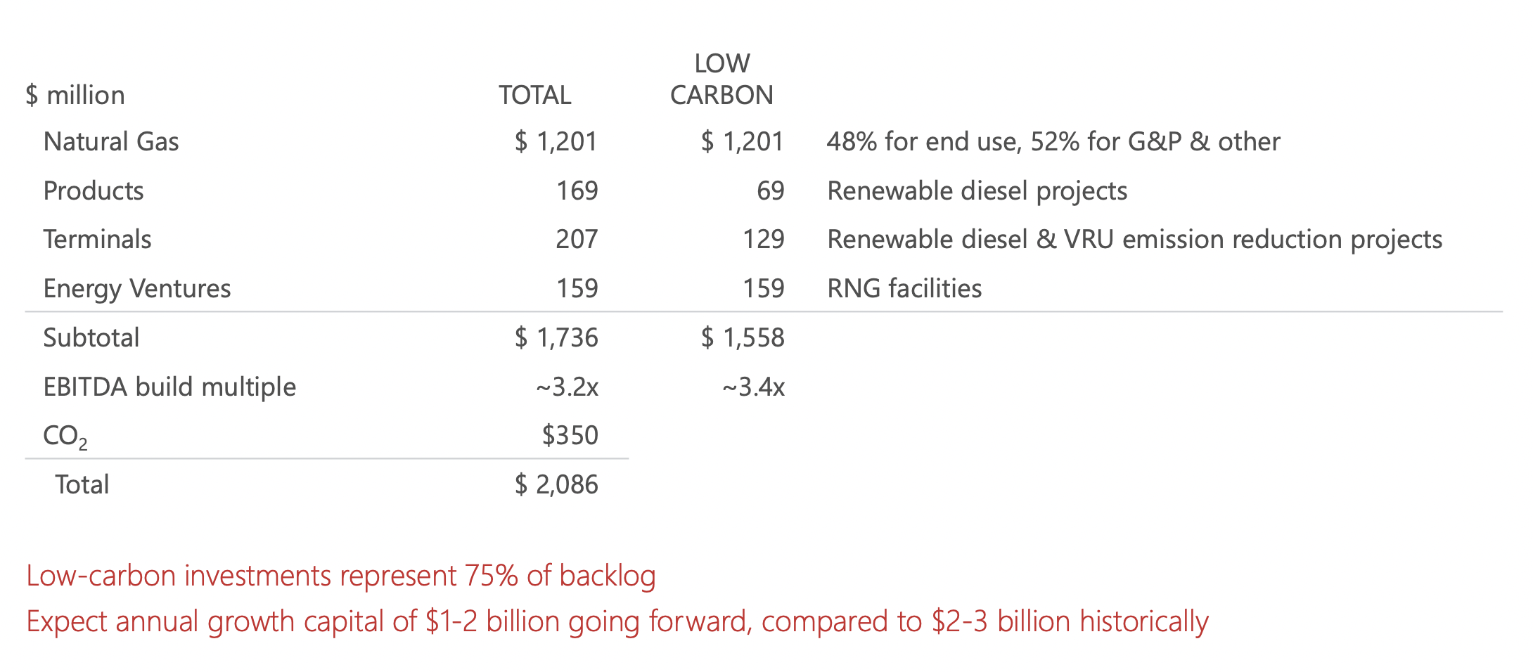 The company has $2.1 billion of total capital spending forecast and it’s assigning $1.6 billion as the low-carbon multiple which is ~75% of capital. The company is expecting $1-2 billion of growth capital going forward, which is a roughly 4% yield from growth capital going forward, and we expect that to enable the company to capturing growth opportunities.